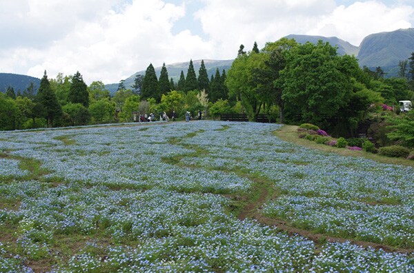 黒川温泉や湯布院温泉などの温泉地にもほど近い同園には、ネモフィラをはじめ、年間を通じて様々な花を楽しむことができます。春シーズンには、11種類の春の花が寄せ植えられた「春彩の畑」が見ごろ。様々な色の花がパッチワークのようで、目を楽しませてくれます。