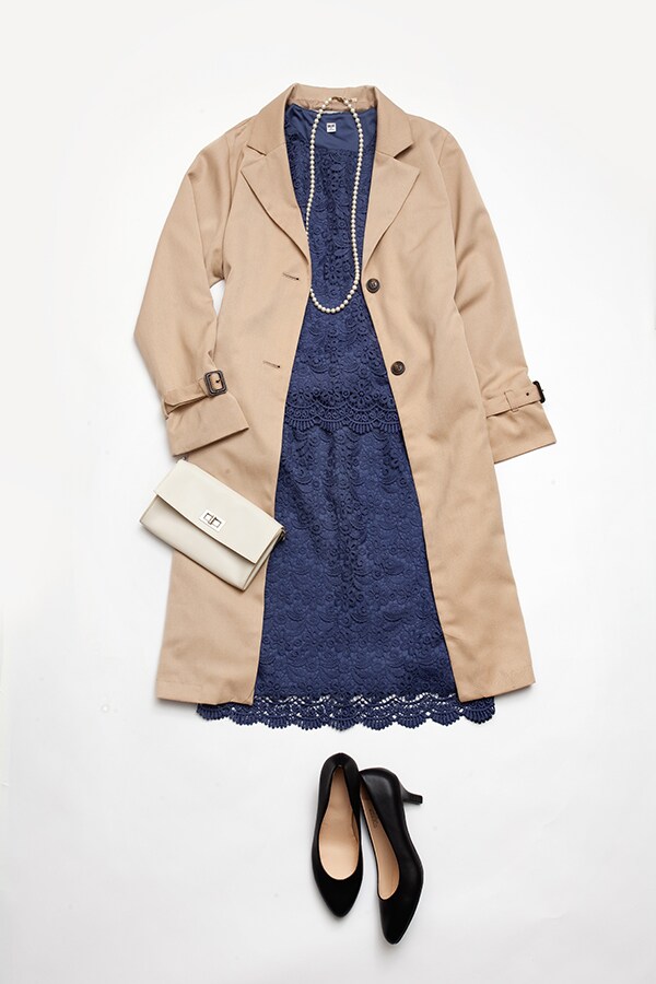また羽織るアウターは、トラッドなトレンチがオススメ。レースの甘さを軽減し、デキるママを演出します。