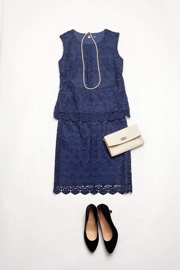 フラワーモチーフのレースを全面にあしらったタイトスカート。ネイビーなら甘くなりすぎず、凛とした印象に見えます。