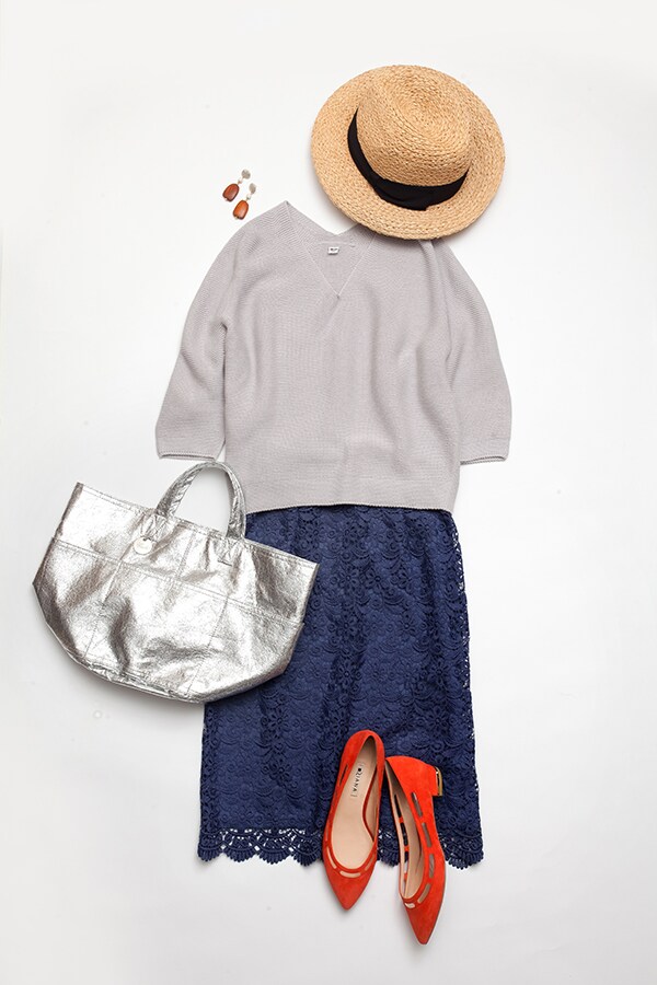 レーススカート2990円、3DコクーンシルエットVネックセーター(※一部店舗とオンラインストアのみで販売)2990円、ラフィアナカオレハット1990円(すべてユニクロ)