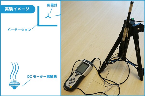 今回の検証には、熱線式風量計を用いました。室内を閉め切った状態にし、エアコンも切る。この状態で、各機種最大風量にした際にどれくらい部屋の空気の対流効果があるのかを調べました。なお、熱線式風量計は直接風が当たることがないよう、パーテーションで区切った同室に置いて計測しました。