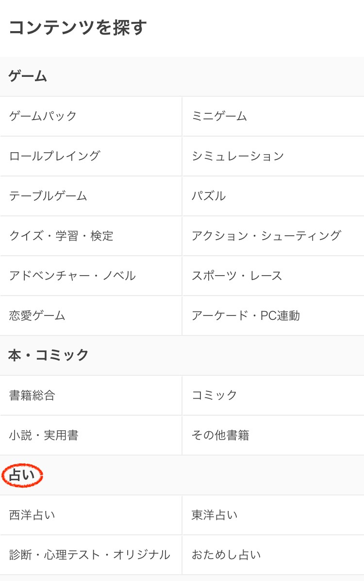 dmenuの「遊ぶタブ」のなかでも、知る人ぞ知る無料コンテンツが占い。「コンテンツを探す」欄の「占い」カテゴリから「おためし占い」をタップしてみて。