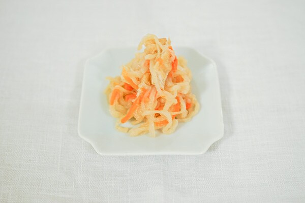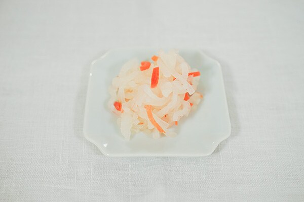 紅白がキレイな「金時人参のなます」は、酸味のきいたしっかりとした味わい。でも、まるみのある柔らかな酸味なので、食べづらさなどは一切ありません。普段の食事の箸休めや疲れているときに食べたくなる味わいです。