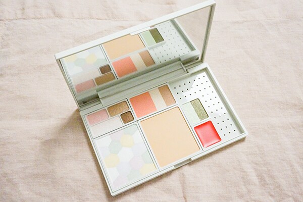今回筆者が使ったのは、「メイクパレット・L」(税込1690円)を含め、「UVパウダーファンデーション・ピンクナチュラル」(税込1190円)、「ルースパウダープレストタイプ・ルーセントホワイト」、「チークカラーミックスタイプ・ピンクベージュ」(税込690円」、「アイカラー4色タイプ・ピンクブラウン」(税込790円)、「アイカラー2色タイプ・グリーン×カーキ」(税込690円)、「リップ&チーク・コーラル」(税子850円)の7点。