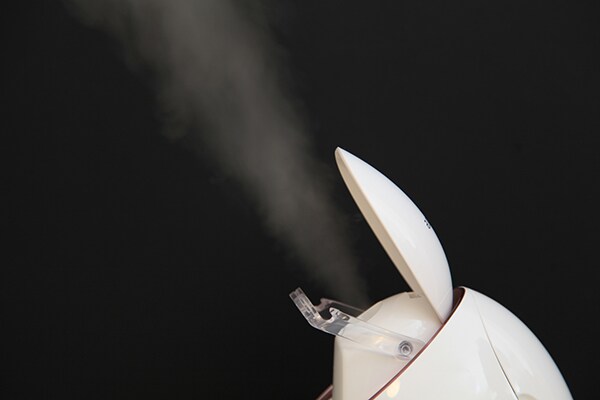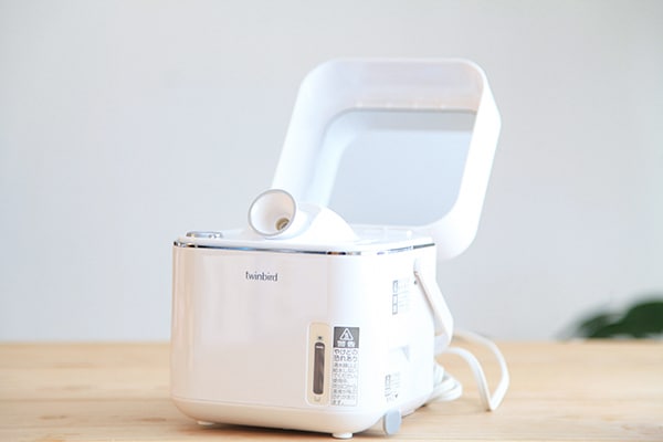 小型の炊飯器のような形をしているこちらは、本体に直接水を注ぎこむタイプ。フタを開けると鏡が付いているからメイク落としの際にも便利で、噴霧口の角度を変えればデコルテの保湿もラクチンです。