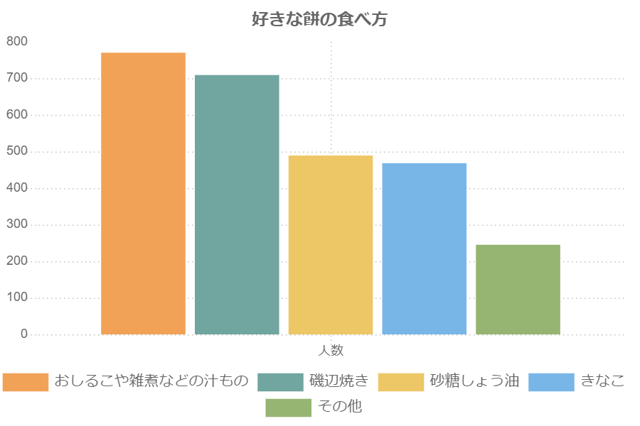 定番でもあり、大本命かと思われた「あんこ」は225人(7%)、「きなこ」は468人(16%)で、「好きなお餅の食べ方ナンバー1」の座を射止めることができず…。1位「おしるこや雑煮などの汁もの」、2位「磯辺焼き」の得票数が、ほかの食べ方よりもひとつ頭が抜けていて、ツートップのよう。