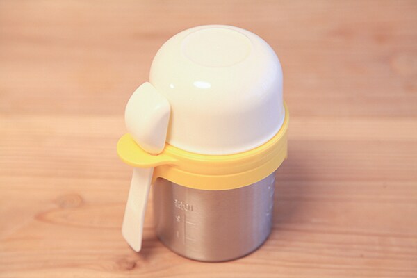 ステンレス製のため、ガラス製に比べややメモリが見にくい感は否めませんが、「離乳食用ガラスのおかゆカップ」と同様、メモリが細かく分かれているのが◎。万が一落としてしまっても割れないという安心感も、高ポイントです。こし網は水を切るときや裏ごしするときにも便利で、小さめの茶碗が付いているのもうれしい。炊き上がり後の蒸らし時間は約15分でOKなので、大人用のごはんと同じくらいで済むのも助かるし、取っ手付きのフタも炊飯器から取り出すときには“あってよかった”と感じました。また、ほかの製品に比べてセット内容が多めではあるものの、コンパクトに収納できるのもメリットですよね。