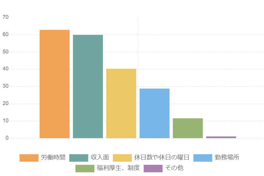 約6割の人が選び1位となったのは「労働時間」。この結果だけでは一概にいえることではありませんが、結婚し子どもを授かったことで、家事や育児のために残業を控えたり、時短勤務を検討したりした人もいるかもしれません。
