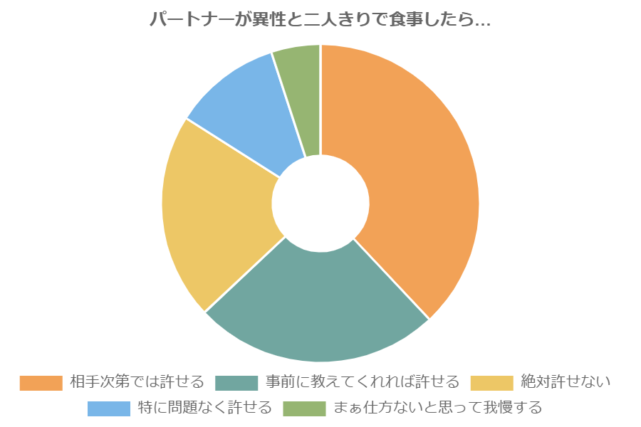 今回は、日常のちょっとした疑問解消に役立つ『みんなの声』から、「パートナーが異性と二人きりで食事…許せる?」(集計期間:2018.11.28〜2018.12.12)というアンケートをピックアップ。5161人の声を集めた結果を見ていきましょう!
