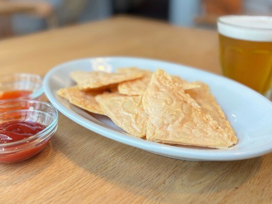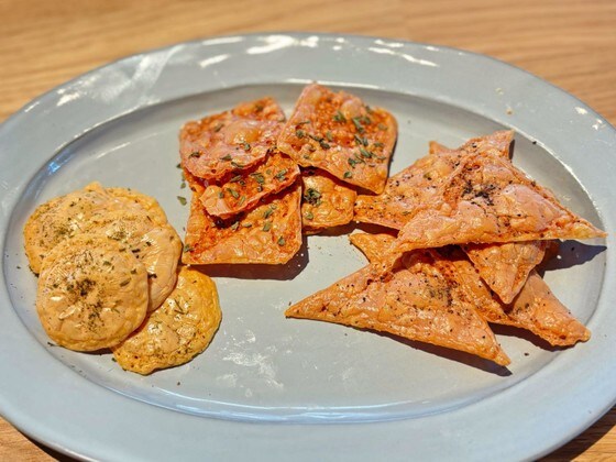 オーブンで焼いたことでチーズの香ばしい風味がより一層引き立ち、コクのあるチップスになりました。塩気はしっかりしていますが、おつまみにぴったりなやみつきになる味です。