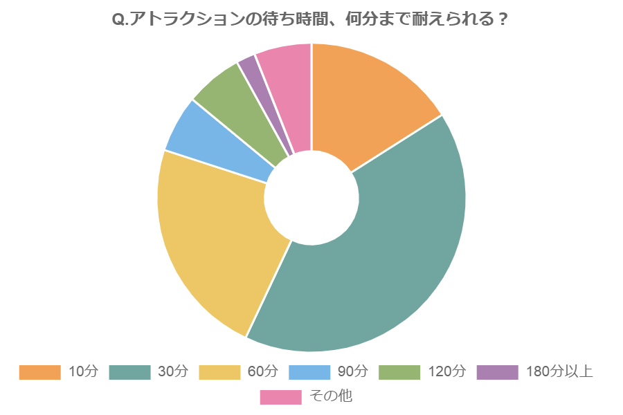4割以上(41%)の人が回答した「30分」が1位でした。長すぎず、ちょうどいい時間かもしれませんね。30分くらいなら、家族でお話していればあっという間に過ぎるでしょうし、絶叫系のアトラクションなら心の準備をするのにもよさそう?