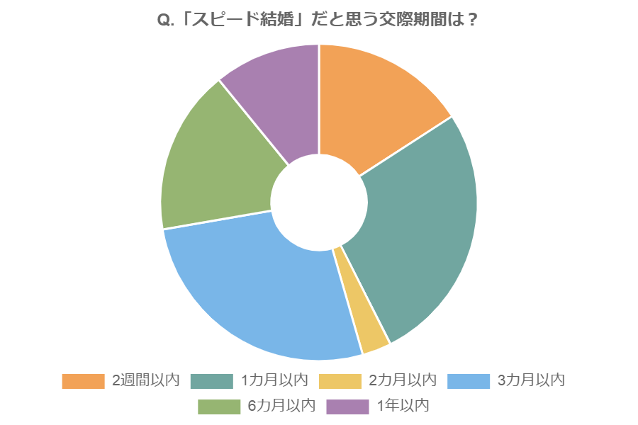 今回の選択肢の中でもっとも短い「2週間以内」は16%獲得していますが、それでも6項目中4番目。それを鑑みると、前述のように「数カ月は交際を続け、慎重に判断する」というのが世間の思う「スピード結婚」ということ?