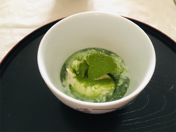 器にバニラアイスを入れ、点てた抹茶を注ぎ、仕上げに少し抹茶の粉を茶漉しでかけます。