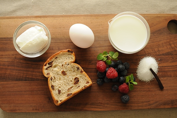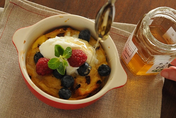卵液に砂糖を加えれば、スイーツ・パンプディングに様変わり。朝食として食べるなら、ヨーグルトとビタミンたっぷりの果物でさっぱりと。ナッツなどを加えれば栄養価もさらにアップします。今回はシナモンがほんのり効いたレーズンパンを使って、朝食にぴったりのスイーツ・パンプディングを作ります。