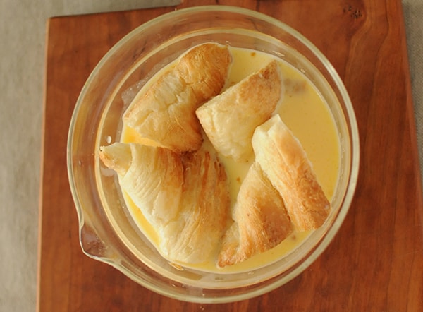 多くのご家庭の冷蔵庫によくある材料を使った、朝食向きのパンプディングをご紹介します。使用するパンは、ついつい余りがちな食パンをはじめ、フランスパンやクロワッサン、ロールパンなど、なんでもOK。卵液に浸すので余って固くなったパンでもおいしく焼き上がります。今回は、クロワッサンを使って作っていきます。