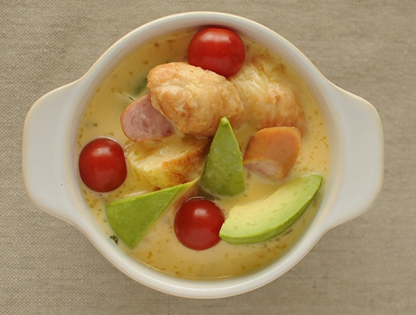 今回は野菜とソーセージを入れて、食物繊維やタンパク質をバランスよく摂れるようにアレンジ。下ごしらえが要らず、そのまま使える食材を選ぶのがポイントです。一皿で、バランスの良い朝食に。