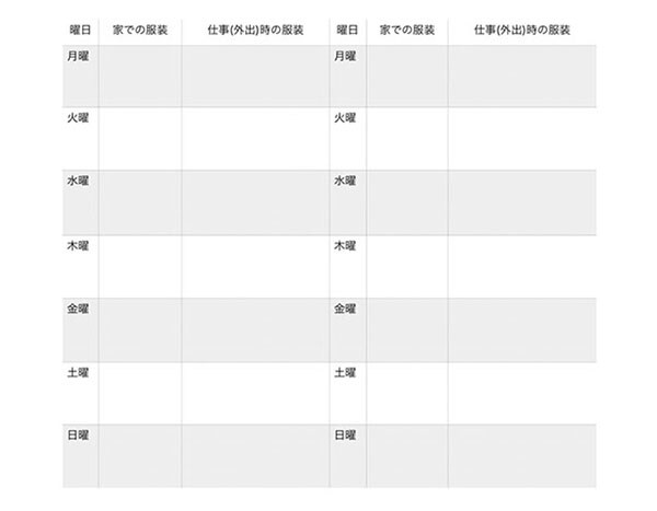 普段どんな時間軸で過ごしているかを、1日と1週間のスケジュールに落とし込んでみると、持つ服の割合を決めやすくなります。普段の自分の行動を服装日記とともにつけてみると意外な事実が見えてきますよ。