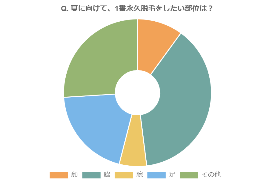 2位は、「その他」が26%。あくまでも予想になりますが、今回の選択肢以外で考えると、「背中」や「うなじ」でしょうか? 浴衣を着て、髪をアップにしたときに見えるうなじは気になりますよね。また、海やプールにでかけることが増える夏。水着を着る機会も多いので、背中を出すことがあるし、デリケートゾーン(VIO)も気になるかも…。