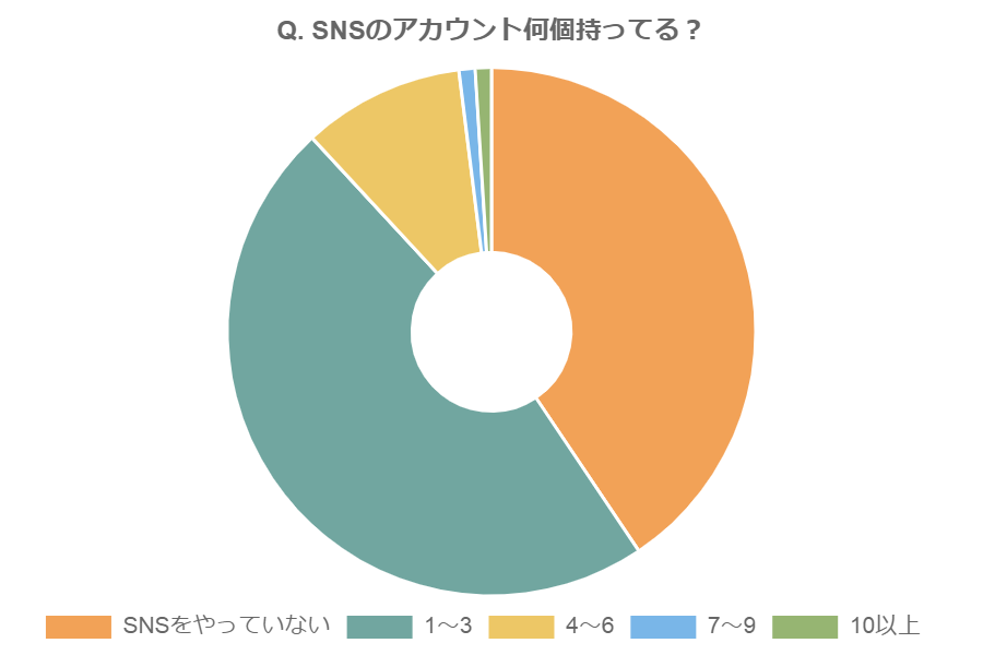 3位には、「4~6」(10%)がランクイン。次いで、「10以上」や「7~9」が続きますが、どちらもわずか1%なので少数派のようですね。1位「1~3」、2位「SNSをやっていない」の2項目で大半を占めているので、SNSのアカウントは0~4個使い分けるのが主流なのかもしれません。