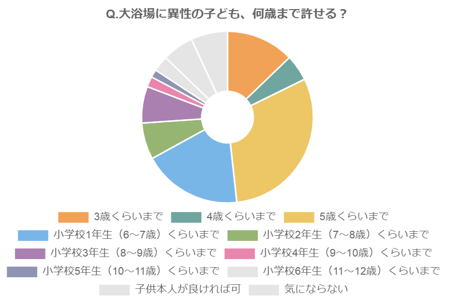 選択項目が11項目と多いため得票率がかなり分散していますが、注目すべきはTOP3の「5歳くらいまで」(31%)、「小学校1年生(6~7歳)くらいまで」(19%)、「3歳くらいまで」(13%)の3つ。ここまでが、10%以上を獲得している項目です。「4歳くらいまで」はわずか5%ですが、上位だけを見れば「3~7歳くらいまで許容」という人が全部で63%と大部分を占めています。