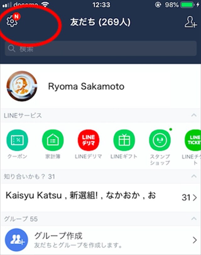 ではこのプッシュ通知機能、内容を非表示にするにはどうしたらいいのか。iphoneを例に紹介しよう。まずはトップ画面左上にある「設定マーク」をタップ。