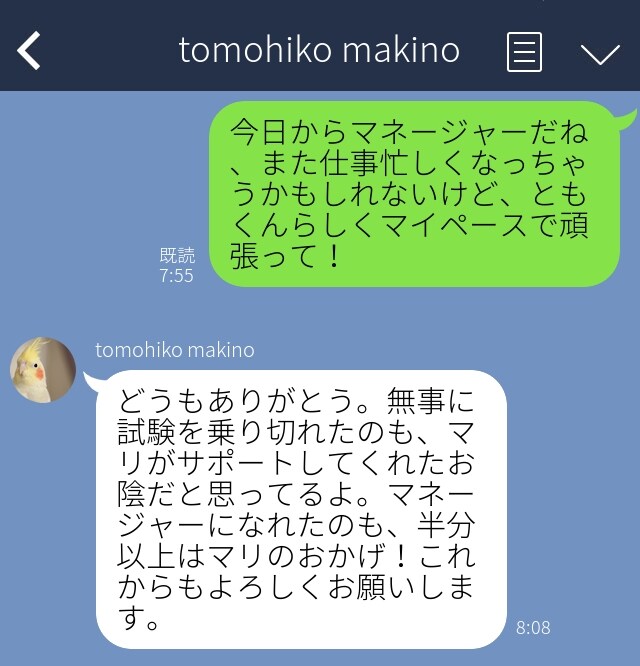 新生活にもらって感動した夫からのLINE、続いて紹介してくれたのは、専業主婦として夫の仕事を支える29歳の美人妻・カナさん。4月からの昇進が決まり、マネージャー職として初出勤する夫へのおめでとうLINEに対する返事がこちら。