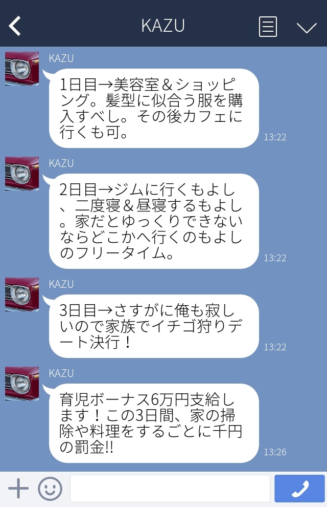 「普段はワンオペ育児だから、本当に大丈夫?という不安はあるけれど、息抜きの時間をもらえるのは嬉しい (29歳・専業主婦)」「休みだけでなく、育児ボーナスとか、家事したら罰金、まで言ってくれるところに本気を感じる(32歳・専業主婦)」「3日目のプラン、俺も寂しいから一緒に過ごす、というのが可愛いと思う(30歳・アパレル)」