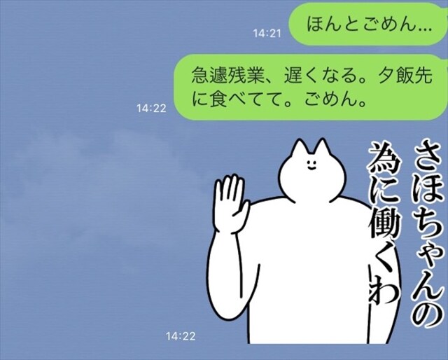 文面だけで見ると、残業や雑用の押し付けに対する罪悪感や妻への愛情があまり感じられない簡素な内容だが、愛情スタンプがあることで、ユーモアと人間味がプラスされている。