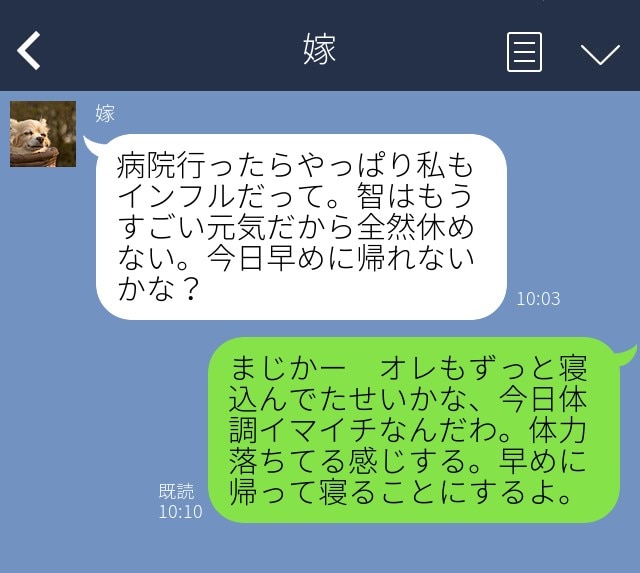 「まさかの自分も体調悪いアピール。しかも大したことないのに。自分がインフルエンザの時には1日中寝込んで私が看病したんですよ。早く帰るとはいえ、自分が寝るためって、そうじゃない!!」