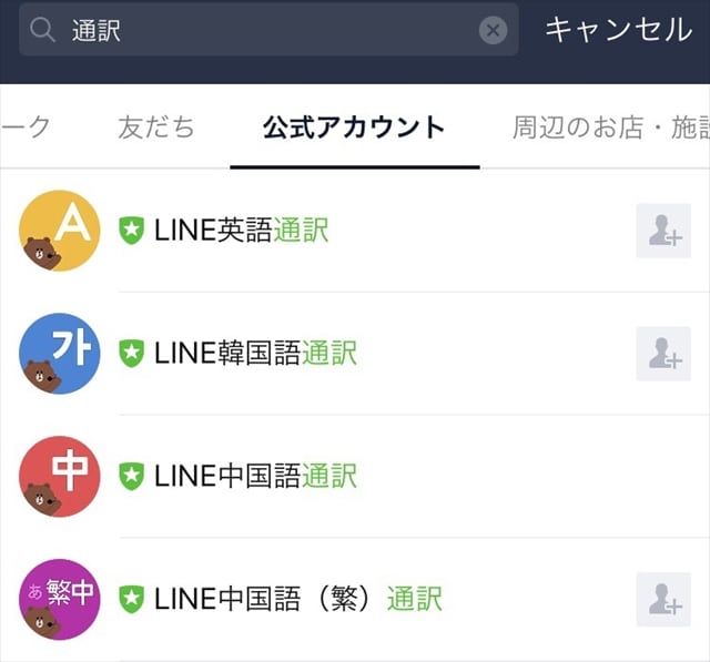 友達追加画面の検索ボックスに「通訳」と入力してみよう。英語・韓国語・中国語が2種類、合計4つの公式通訳アカウントが表示される。右側の「+」をタップして友達に追加するだけで、翻訳機能を使用することができる。