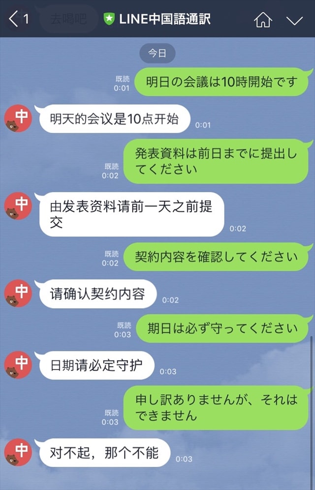 「明日の会議は10時開始です」「契約内容を確認してください」など、短文ではあるが重要なフレーズ。念のため中国人のビジネスパーソンにチェックを依頼したところ、「特に問題なく通じる」とのお墨付きを得た。