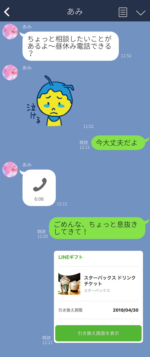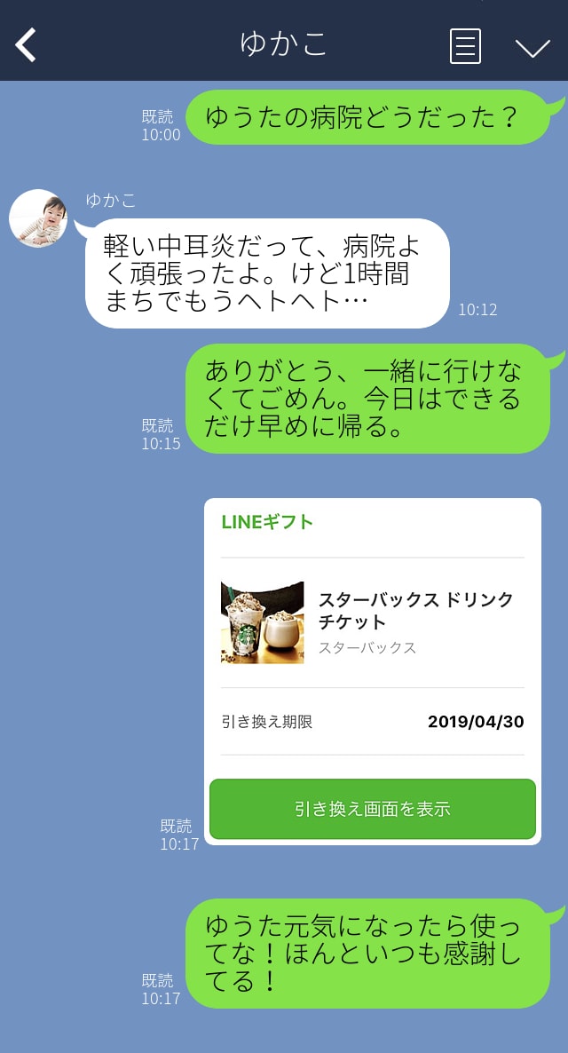 「子どもが体調を崩すと、毎回通院をねぎらってLINEギフトを贈ってくれます。病院に付き添ってくれる旦那さんを羨ましく思うこともあるけれど、こちらが大変なのを理解してくれていることが嬉しいです。」