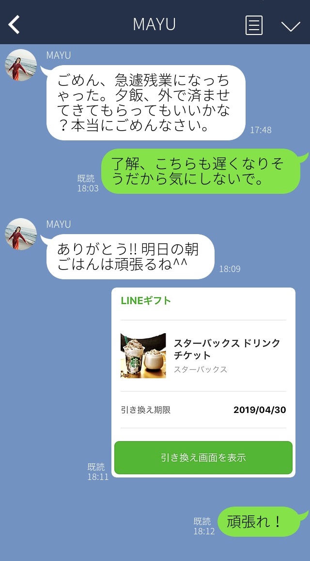 「朝食は夫が、夕食は私が作るというルールなのですが、急な残業が入るとムリなこともあって。悪いな、って思いながら連絡したときに、逆に向こうから頑張れって声をかけてもらって、すごく愛を感じました。それ以来、夫が遅くなる日には私からもギフトしています。」