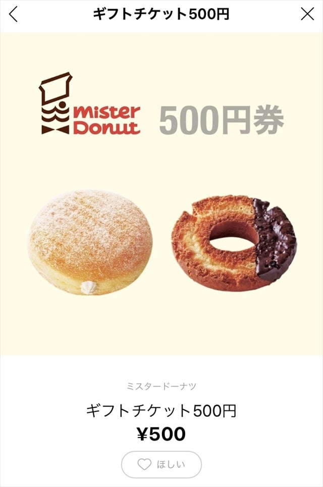 なお二番人気は「ミスタードーナツギフトチケット」。イートイン、テイクアウトどちらでも使用可能で、ドーナツ以外のドリンク等にも有効だ。