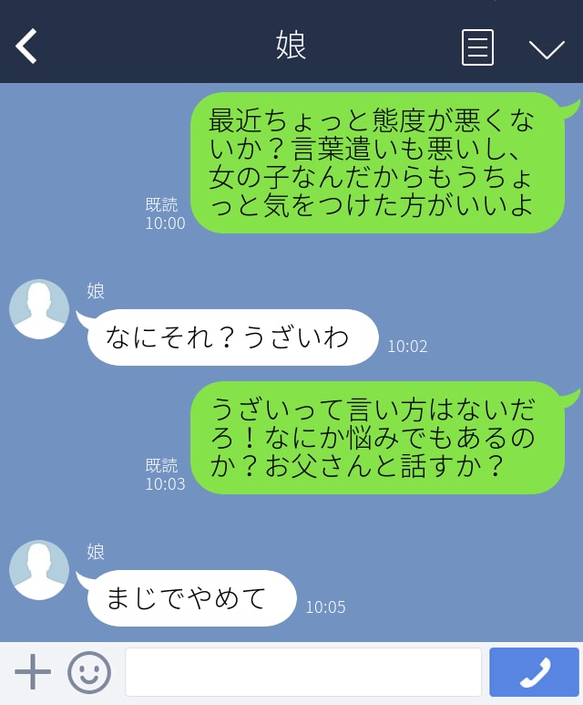 特に女の子に多いのが、父親には冷たい態度をとってしまうというケース。母親には可愛いスタンプを送ったり、自分の写メを送ったりするのに対して、父親には絵文字さえも送らないという。