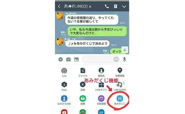 例えば、子どもの送り迎えやゴミ出しなど、夫婦のどちらがやるか決めなければいけないことがあるとき、お互いに忙しいとつい押し付け合いになってしまいがちだ。そんなときはLINEの「あみだくじ」機能がオススメである。
