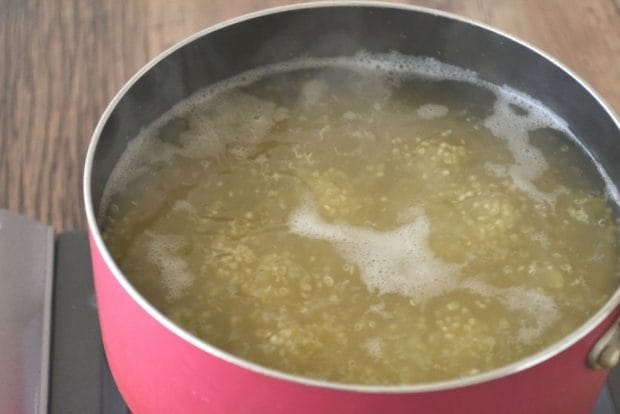 2) 鍋にたっぷりのお湯を沸かして、キヌアを入れて15~20分茹でます。(キヌアの粒から白いひげのようなものが出てきて粒が透明になってきたら茹で上がり。ゆで時間はお好みの固さに調整を)