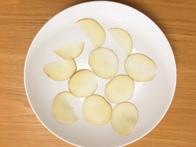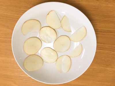 2 )大きめのお皿にジャガイモが重ならないよう並べましょう。その後、500Wの電子レンジで3分加熱。塩味を付けたい場合は、このタイミングで塩を振っておきます。