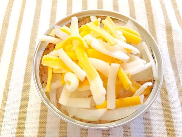 こちらはツナ缶+玉ねぎ+ピザ用チーズ。筆者は色違いのミックスチーズを使っていますが、普通のピザチーズでもちろんOKですよ。とろけるチーズでも良いかも。