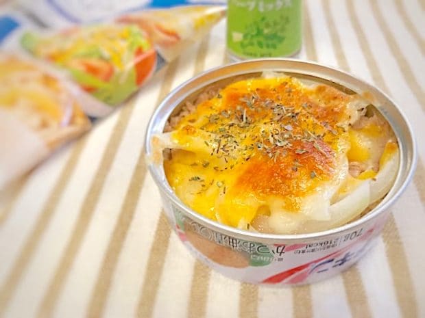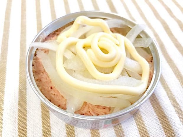 油を切ったツナ缶に、スライスした玉ねぎ、マヨネーズを乗せます。玉ねぎ・マヨネーズはお好みの量でOK。それをトースターで5〜10分ほど焼いたら完成です。