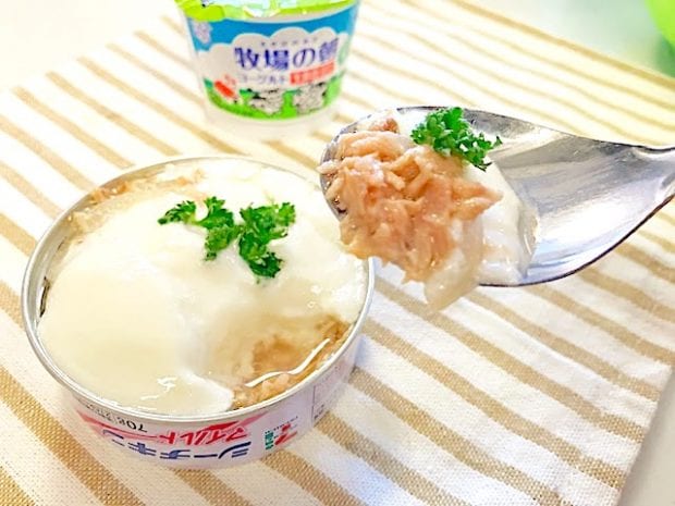 ヨーグルトソースのかかったツナ缶。見た目はなんとなくスイーツっぽいでしょうか。食べてみると、ヨーグルトのあっさりとした味わいと酸味が、まるでドレッシングみたい。無糖のヨーグルトで作ったら、さらにサラダっぽかったのかも。