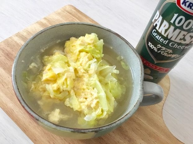 チーズ入りのふんわり溶き卵がおいしい、簡単キャベツスープです。