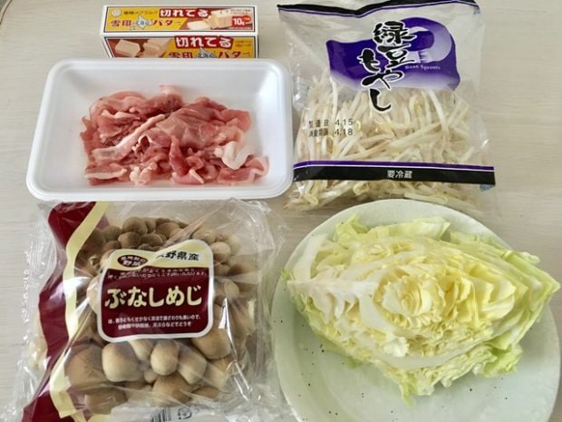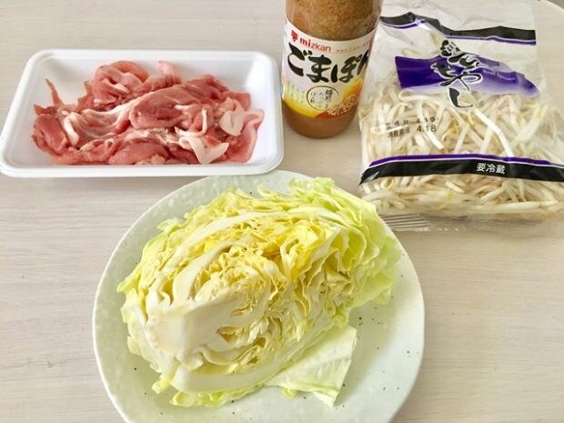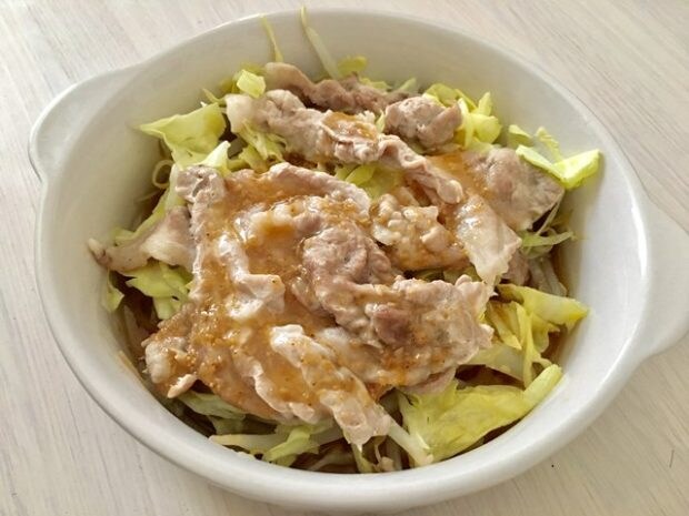 作り方はとっても簡単。耐熱皿にもやし、千切りにしたキャベツ、豚肉の順に重ね、めんつゆとお酒を少々。ラップをして、レンジでチン。これだけ!