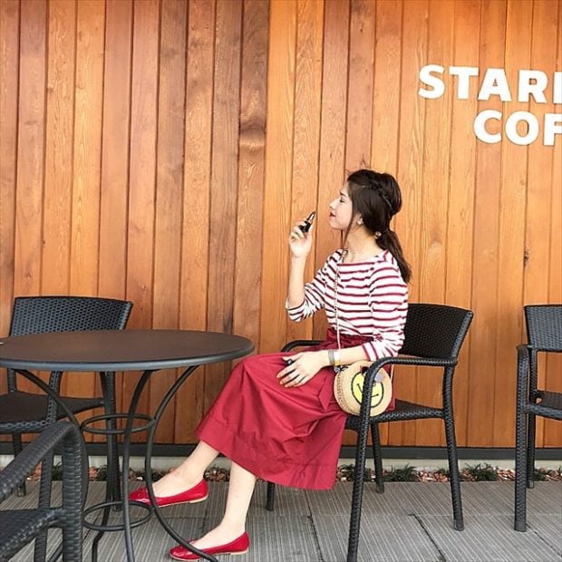 シューズやメイクもレッドで統一しながら、おちゃめなカゴバッグで、大人の遊びゴコロが詰まっている、このコーデ! カラーによって印象が変わるのもこのスカートの魅力。普段選ばないカラーにも挑戦してみて。
