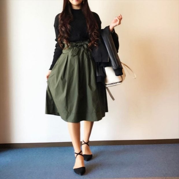 オリーブのスカートにシンプルなブラックのトップスをチョイスすれば、オフィス向けのコーデにシフト可能。上品さのあるコーデで好感度アップを狙って。ウエスト周りは総ゴムなので、オフィスでもアクティブに動けます。ハイウエストで脚長効果もバッチリ!