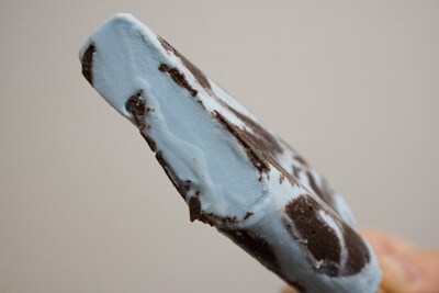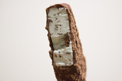 その断面がこちら。想像よりもチョコクッキーが少なめですが、それ以上にミント感がとても強いことに驚きました! 決してミルキーな味わいではなく、甘さ控えめで後味もサッパリ。「これぞチョコミント!」と言っても過言ではない、個人的にオススメの一本です!