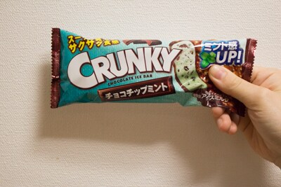 まずは「ロッテ」の定番チョコレート、「クランキー」をアイスにした「クランキーアイスバー チョコチップミント」から試していきます。