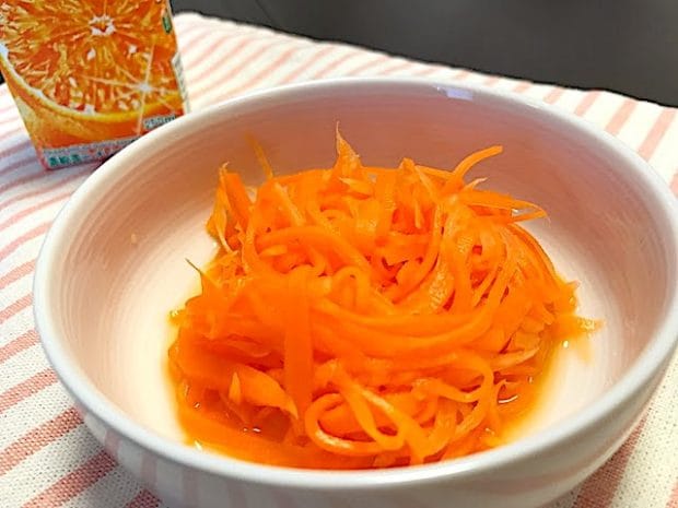 冷蔵庫で冷やしたら完成。材料も少なくて簡単すぎる……!! オレンジジュースとの相性も良く、さっぱりとした味わいのキャロットラペになりますよ。