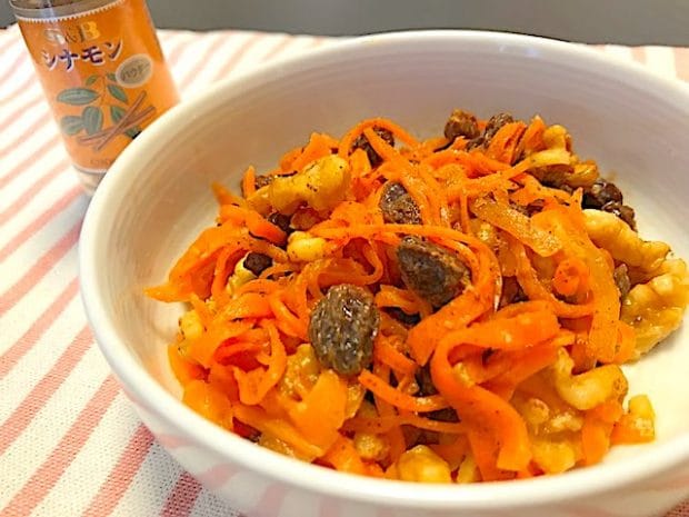 千切りにしたにんじんに、はちみつ、オリーブオイル、レモン汁をそれぞれ小さじ1。さらにシナモンとレーズン、砕いたナッツを適量和えてできあがりです。