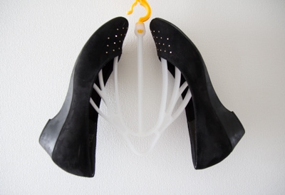 個人的にとても便利だと感じたのがセリアなどで手に入る「シューズハンガー」。濡れた靴はこちらのハンガーにかけておくだけで、驚くほど速く乾きます。